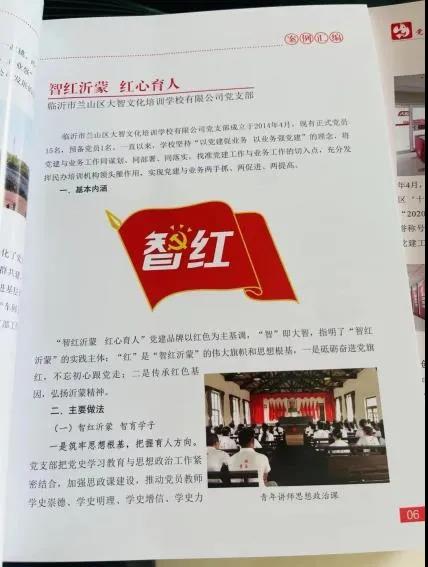大智臨沂區(qū)域成立于2011年,在蘭山區(qū)委組織部、蘭山區(qū)教育和體育局及集團黨委的大力支持和領(lǐng)導下,于2014年4月成立黨支部,后又相繼成立了團總支、婦女委員會、工會等群團組織,經(jīng)過實踐探索,大智臨沂區(qū)域打造了”智紅沂蒙三個三“工作法、“智紅沂蒙 紅心育人”黨建工作品牌,真正做到服務社會,服務企業(yè),服務黨員。在黨建工作中不斷創(chuàng)新并與其他黨支部進行了黨建共建。