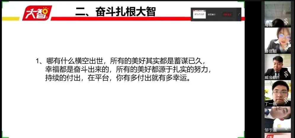 3月25日下午,大智教育集團黨委委員、小班黨支部書記楊愛彬,為大智黨員們帶來“向陽計劃”第三講精彩內(nèi)容分享——《大智助我成長》。部分黨員在現(xiàn)場參加培訓,其他各區(qū)域(公司)的黨員們通過視頻連線的方式參加培訓。