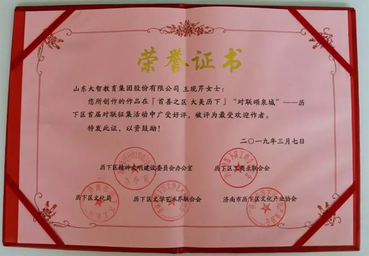 03月07日,『首善之區(qū) 大美歷下』“對(duì)聯(lián)頌泉城”——?dú)v下區(qū)首屆對(duì)聯(lián)征集評(píng)選活動(dòng)頒獎(jiǎng)典禮在濟(jì)南市歷下區(qū)歷下大廈舉行。大智控股集團(tuán)黨委書(shū)記王現(xiàn)芹作為獲獎(jiǎng)?wù)呤苎麉⒓拥涠Y。