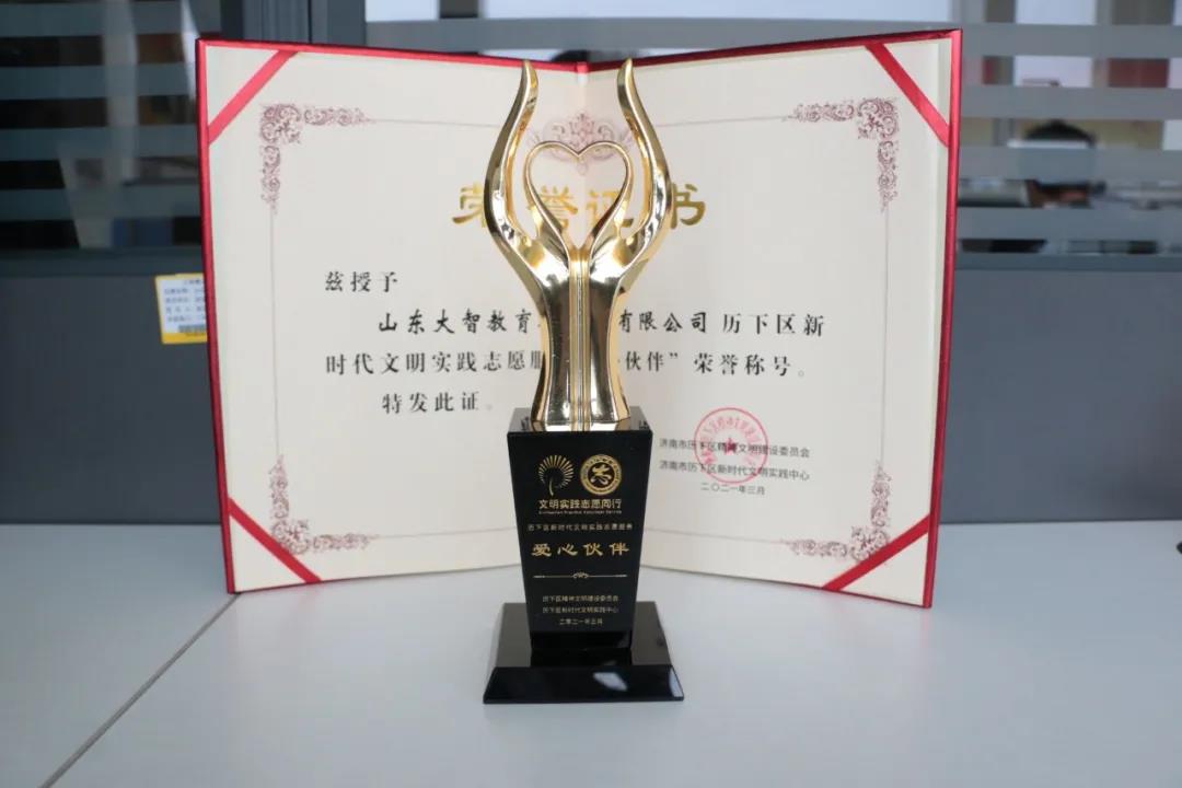 濟(jì)南市歷下區(qū)精神建設(shè)委員會(huì)和濟(jì)南市歷下區(qū)新時(shí)代文明實(shí)踐中心授予山東大智教育集團(tuán)有限公司歷下區(qū)新時(shí)代文明實(shí)踐志愿服務(wù)“愛(ài)心伙伴”稱號(hào),并授予了榮譽(yù)獎(jiǎng)杯及證書(shū)。