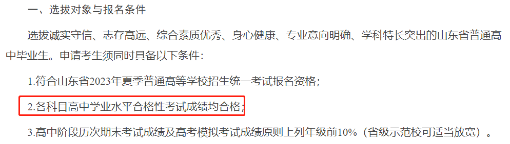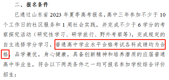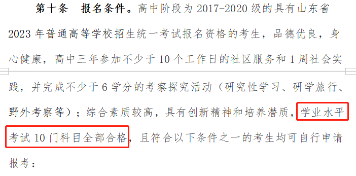 ?青島大學(xué):在2023年綜合評價招生的報名條件中有明確的規(guī)定,普通高中學(xué)業(yè)水平合格考試10門科目全部合格。