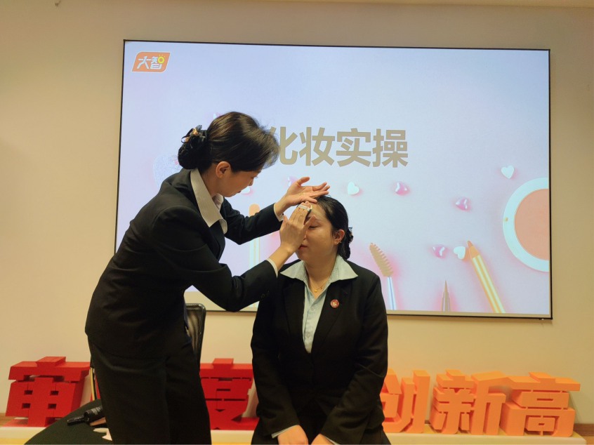 大智控股集團市場部總監(jiān)陳婷婷針對學科導師的職業(yè)特性,傳授了快速高效的日常妝容打造技巧,包括底妝選擇、眼妝自然提亮、唇色搭配等實用知識。婷婷總監(jiān)提到:“化妝不僅是外在美的提升,更是對自我和他人的尊重。作為學科導師,妝容應簡潔大方,既展示專業(yè)性,又拉近與學生的距離?!辈F(xiàn)場進行化妝實操。
