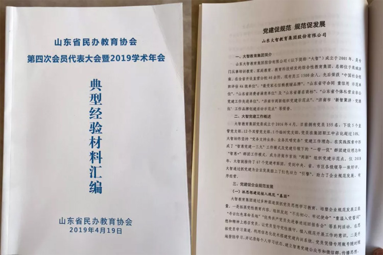 特別值得一提的是,《山東省民辦教育協(xié)會第四次會員代表大會暨2019學術年會典型經驗材料匯編》刊登了大智“黨建促規(guī)范 規(guī)范促發(fā)展”的典型經驗材料。