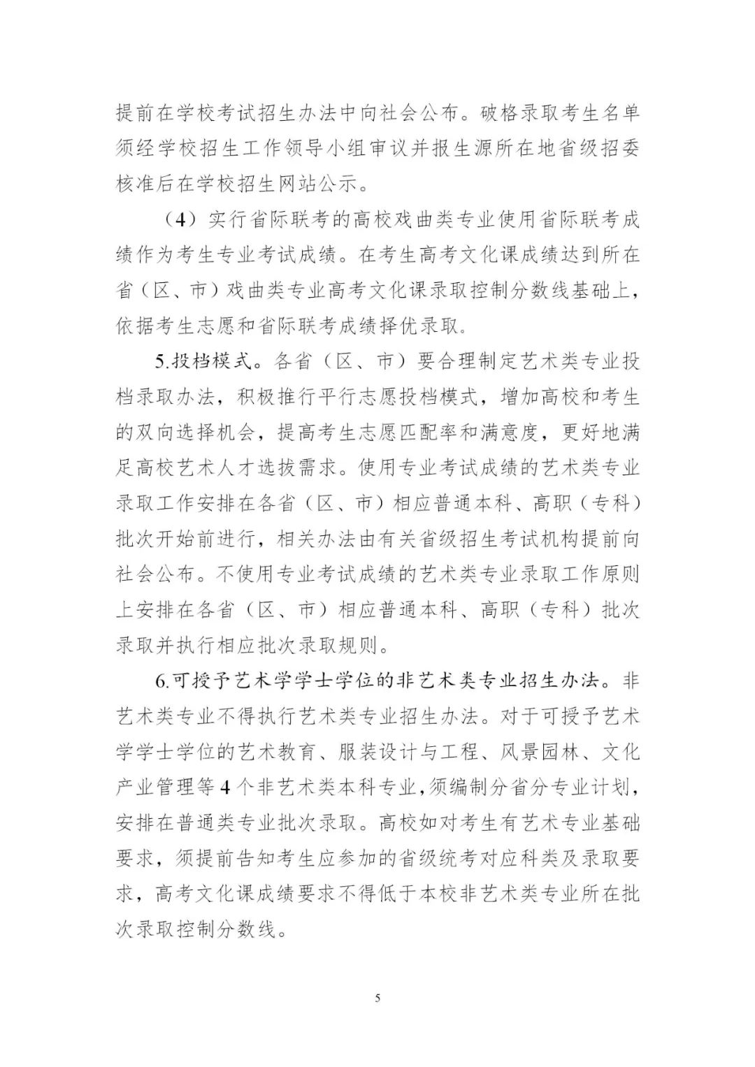 3.平穩(wěn)做好藝術(shù)類考試招生。各地要認(rèn)真落實(shí)藝術(shù)類專業(yè)考試招生改革部署,進(jìn)一步加強(qiáng)省級(jí)統(tǒng)考能力建設(shè),考試科類基本實(shí)現(xiàn)全覆蓋。要對(duì)照有關(guān)工作規(guī)范,完善省級(jí)統(tǒng)考科目和內(nèi)容,優(yōu)化考試組織和流程,推進(jìn)省級(jí)統(tǒng)考提質(zhì)增效。要科學(xué)制定藝術(shù)類專業(yè)招生錄取辦法,確保改革平穩(wěn)落地。少數(shù)專業(yè)特色鮮明、人才培養(yǎng)質(zhì)量較高的藝術(shù)院校,經(jīng)省級(jí)教育行政部門批準(zhǔn)可在省級(jí)統(tǒng)考基礎(chǔ)上組織個(gè)別專業(yè)??肌S嘘P(guān)高校要結(jié)合人才培養(yǎng)定位,科學(xué)制定??紝I(yè)考試招生辦法,加強(qiáng)與省級(jí)統(tǒng)考銜接,合理確定??夹问郊皟?nèi)容。2024年起,高校高水平藝術(shù)團(tuán)不再從高校招生環(huán)節(jié)選拔,由有關(guān)高校從在校生中遴選培養(yǎng)。