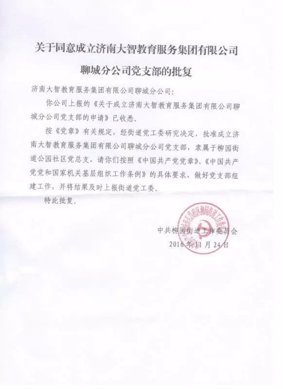 大智控股集團(tuán)黨建再添新彩,繼青島、臨沂、淄博之后,聊城區(qū)域黨支部正式成立。2016年11月24日,中共聊城市東昌府區(qū)柳園街道工作委員會(huì)正式批復(fù)同意成立中共濟(jì)南大智控股服務(wù)集團(tuán)有限公司聊城分公司支部委員會(huì)。