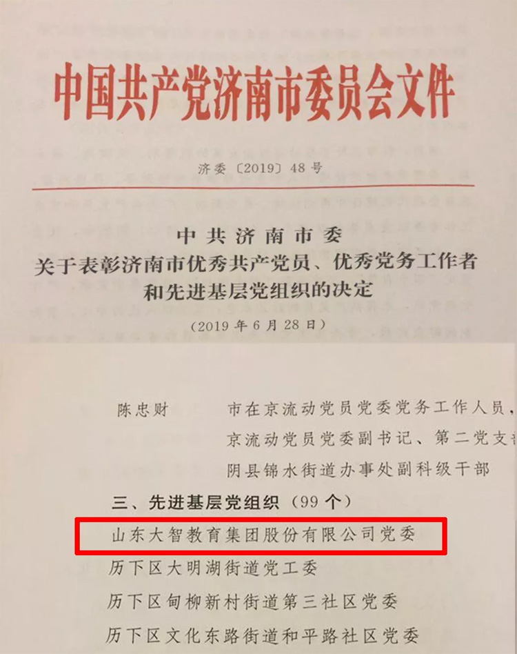 通過(guò)務(wù)實(shí)開(kāi)展黨建工作,大智成為濟(jì)南市首批“兩新”組織黨建工作示范點(diǎn),先后被評(píng)為“工人先鋒號(hào)”、“山東省青年文明號(hào)”、“山東省個(gè)體私營(yíng)企業(yè)非公黨建工作先進(jìn)單位”、“新智聚濟(jì)?黨旗紅”工作品牌創(chuàng)建活動(dòng)首批示范點(diǎn)等。大智控股集團(tuán)黨委書(shū)記王現(xiàn)芹被命名為濟(jì)南市擔(dān)當(dāng)作為“出彩型”好書(shū)記,并榮獲“紀(jì)念改革開(kāi)放40周年我為兩新黨建打CALL”活動(dòng)金雁獎(jiǎng),被聘為兩新黨建“先鋒導(dǎo)師”。