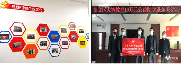 大智控股集團(tuán)黨委自成立以來,始終堅持“黨務(wù)支持業(yè)務(wù),業(yè)務(wù)反哺黨務(wù)”的工作理念,創(chuàng)新開展黨建工作。在集團(tuán)黨委的指導(dǎo)下,濰坊區(qū)域黨支部逐步形成支部特色工作法——“智紅鳶都一三三六”支部工作法,不忘初心跟黨走,牢記使命勇?lián)?dāng),充分發(fā)揮黨組織的戰(zhàn)斗堡壘作用和黨員的先鋒模范作用;在全面抗擊新冠疫情過程中,積極踐行社會責(zé)任,聯(lián)合奎文區(qū)東關(guān)街道共同發(fā)起“送課進(jìn)‘疫’線公益助學(xué)”活動,捐贈助學(xué)金共10萬元。