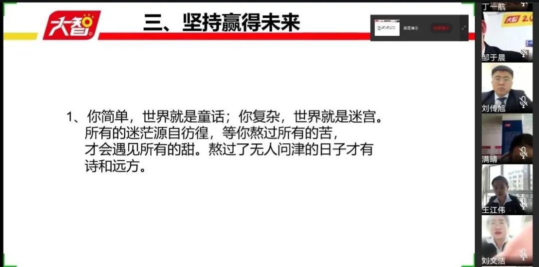3月25日下午,大智教育集團黨委委員、小班黨支部書記楊愛彬,為大智黨員們帶來“向陽計劃”第三講精彩內(nèi)容分享——《大智助我成長》。部分黨員在現(xiàn)場參加培訓,其他各區(qū)域(公司)的黨員們通過視頻連線的方式參加培訓。