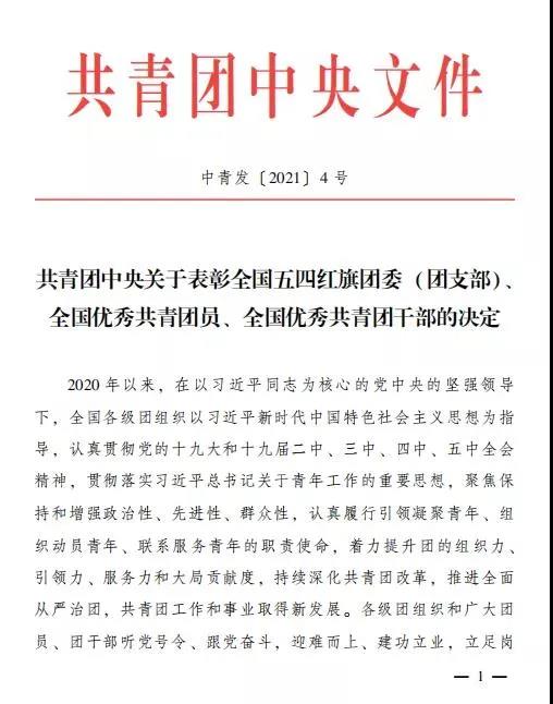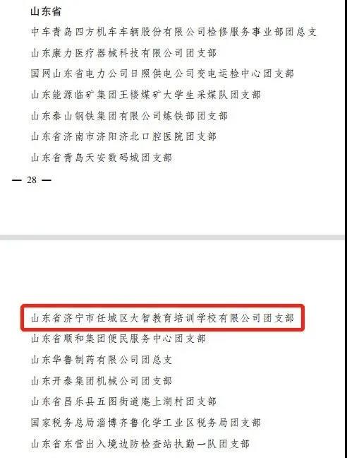 4月27日,共青團(tuán)中央發(fā)布《關(guān)于表彰全國五四紅旗團(tuán)委(團(tuán)支部)、全國優(yōu)秀共青團(tuán)員、全國優(yōu)秀共青團(tuán)干部的決定》,山東省濟寧市任城區(qū)大智教育培訓(xùn)學(xué)校有限公司團(tuán)支部榮獲2020年度“全國五四紅旗團(tuán)支部”榮譽稱號,這是共青團(tuán)中央授予全國基層團(tuán)組織的最高榮譽。