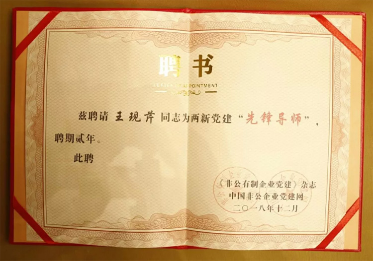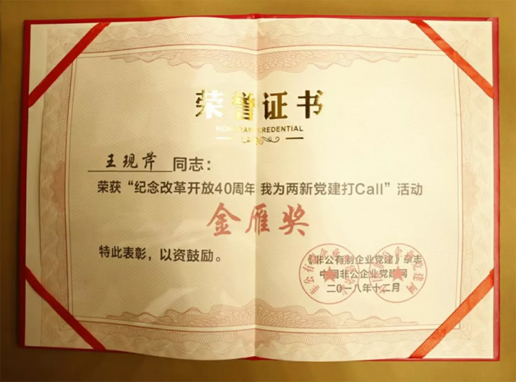 在此前《非公有制企業(yè)黨建》雜志社組織的“紀念改革開放40周年,我為兩新黨建打call”大型視頻展播活動中,來自全國的300余名兩新黨組織書記參與到活動中,王現(xiàn)芹的先進事跡視頻脫穎而出,成為全國40名“紀念改革開放40周年 我為兩新黨建打CALL”金雁獎獲獎者之一。