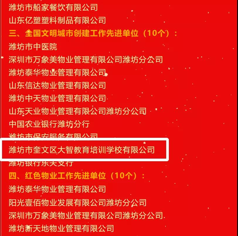 自濰坊市文明城市創(chuàng)建以來,大智濰坊區(qū)域拼搏實干,奮勇爭先,做文明創(chuàng)城的宣傳者、踐行者,落實疫情防控工作,深化精神文明創(chuàng)建,積極踐行社會責(zé)任,營造了向上向善、文明安全的良好氛圍。近日,大智濰坊區(qū)域榮獲“2020年度全國文明城市創(chuàng)建工作先進(jìn)單位”稱號。