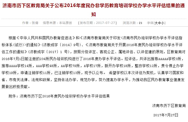 10月29日,從濟(jì)南市教育局傳來(lái)喜訊,濟(jì)南市歷下區(qū)大智培訓(xùn)學(xué)校在2016年度民辦培訓(xùn)學(xué)校辦學(xué)水平評(píng)估中,被評(píng)為 “AAAAA學(xué)校”,根據(jù)《濟(jì)...