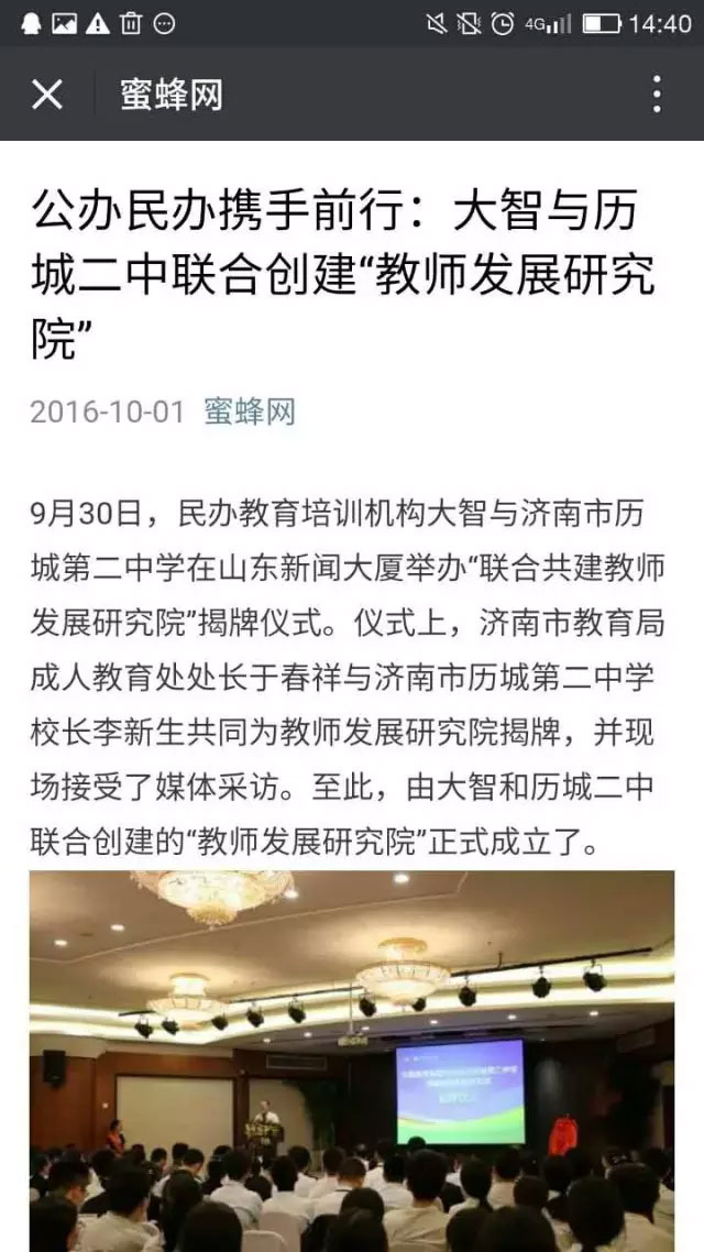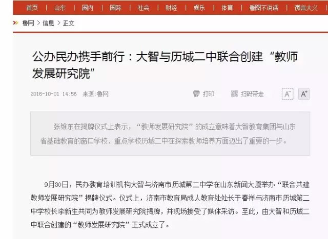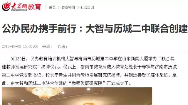 10月01日,《生活日報》08版,發(fā)文指出,大智與歷城二中合建“教師發(fā)展研究院”開創(chuàng)了民辦教育與公辦教育合作新模式,為教育培訓(xùn)機構(gòu)探索出新路子,是教育改革的重大突破。