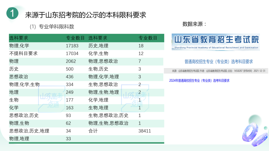 從圖中我們可以了解到,關(guān)于限科需要了解的數(shù)據(jù)和信息包含了六大方面,比如:相關(guān)大學(xué)和專業(yè)對各單科或組合有怎樣的限科要求,20種科目組合的報考機會是怎樣的,本科和??茖W(xué)校及專業(yè)對限科的要求是否一致,本科具體的招生計劃以及限科要求是怎樣的情況,山東省選科人數(shù)的分布情況,另外就是很多數(shù)據(jù)都是經(jīng)過數(shù)據(jù)源的分析,我們的家長要了解數(shù)據(jù)源來自哪里,我們要掌握到第一手資料,然后有針對性地去看一看,才能夠更加確信相關(guān)的內(nèi)容。