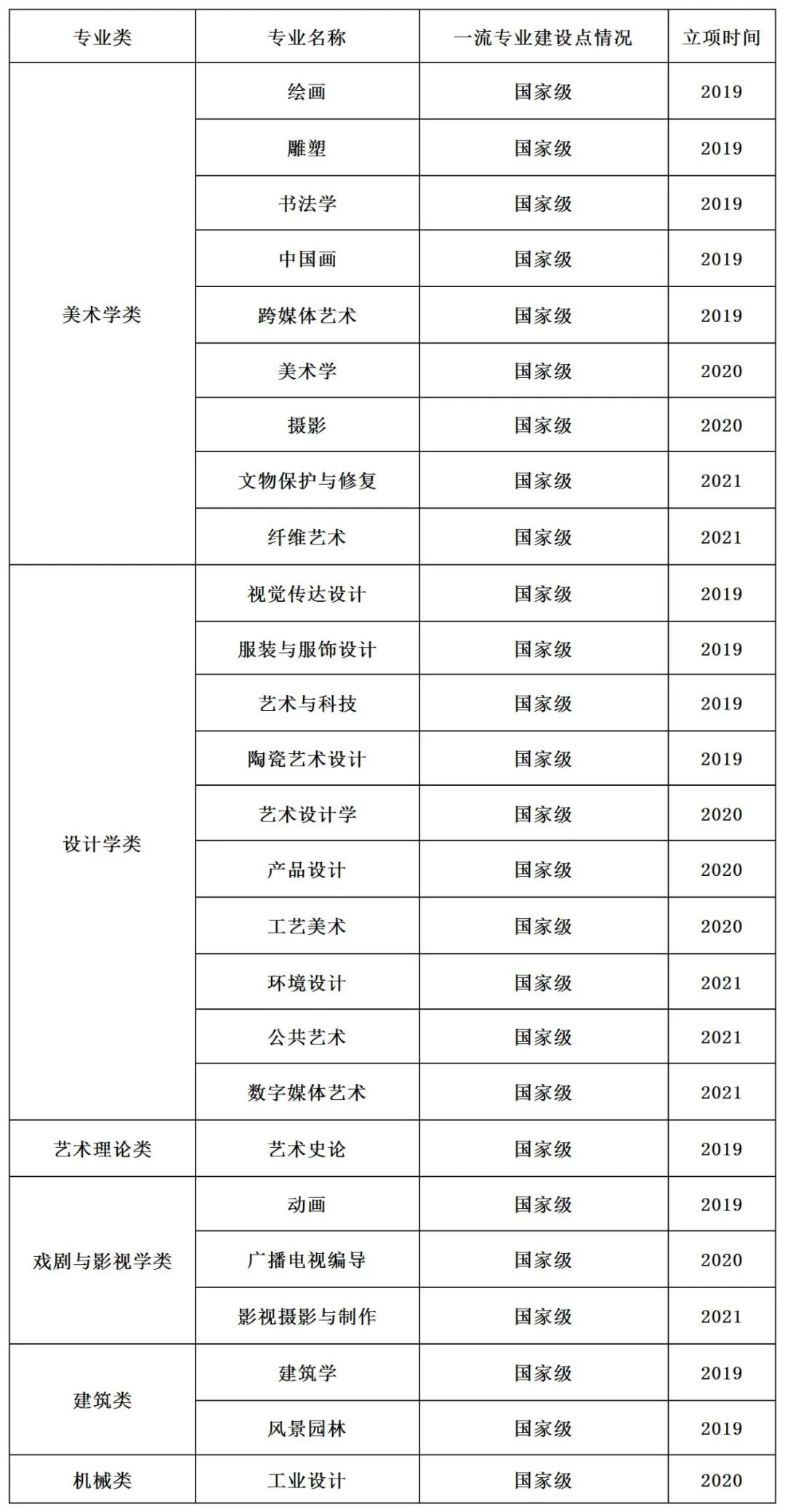 省級一流本科專業(yè)建設(shè)點(diǎn):動(dòng)畫、影視攝影與制作、繪畫、雕塑、環(huán)境設(shè)計(jì)、產(chǎn)品設(shè)計(jì)、數(shù)字媒體藝術(shù)、公共藝術(shù)、美術(shù)學(xué)、藝術(shù)史論、建筑學(xué)、服裝設(shè)計(jì)與工程、包裝工程、文化產(chǎn)業(yè)管理、表演、戲劇影視美術(shù)設(shè)計(jì)、攝影