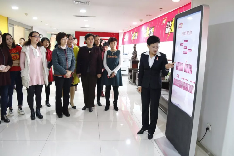 王現(xiàn)芹首先從整體上向大家介紹了大智 “執(zhí)行、誠信、關(guān)愛”的企業(yè)文化和組織架構(gòu)。并帶領(lǐng)大家參觀了大智控股集團黨群陣地。詳細向領(lǐng)導們介紹了大智“智惠黨建一三九”工作模式、所開展的黨建系列活動。以黨建為引領(lǐng),大智形成了“一帶一促”群團建設(shè)理念,打造了獨具特色的智惠工會、智惠團建、智惠婦建和智惠統(tǒng)戰(zhàn),黨群建設(shè)工作取得實效成果。