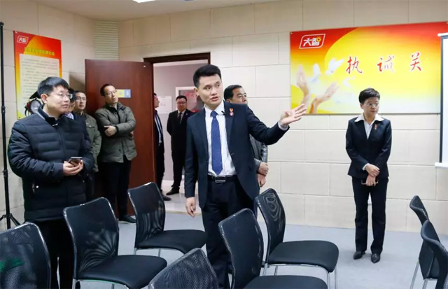 李開良一行首先參觀了大智控股集團(tuán)總部,從整體上了解了大智的發(fā)展歷程與企業(yè)文化,重點(diǎn)了解了大智“智惠黨建一三九”工作模式以及黨建引領(lǐng)下的大智 “一帶一促”群團(tuán)建設(shè)理念和“智惠+”群團(tuán)建設(shè)模式。