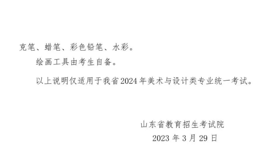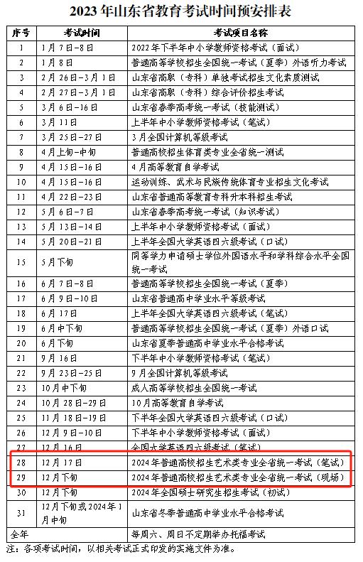 據(jù)山東省招生考試院發(fā)布的通知安排,2024年普通高校招生藝術(shù)類專業(yè)全省統(tǒng)一考試(筆試)將于2023年12月17日舉行,2023年12月下旬舉行2024年普通高校招生藝術(shù)類專業(yè)全省統(tǒng)一考試(現(xiàn)場)。