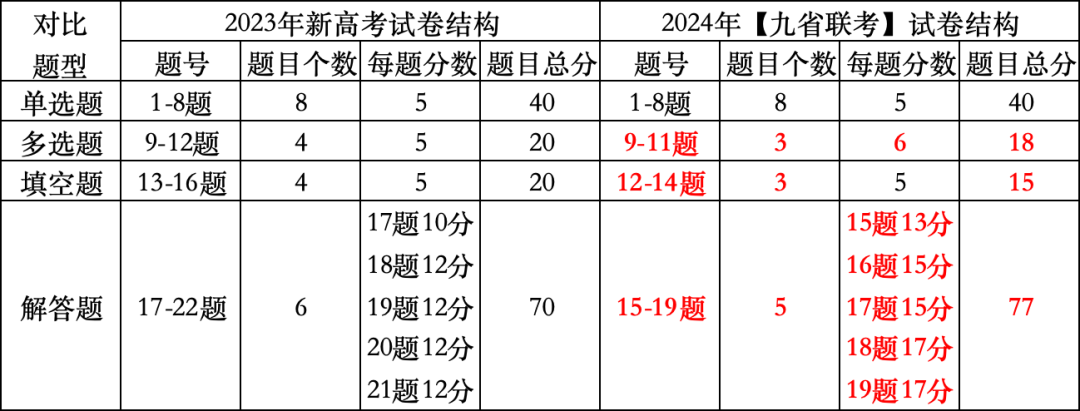 首先,相較于2023年高考,試卷結(jié)構發(fā)生很大變化,小題分值大幅減少,大題題量減少,但是難度和分值都增加。