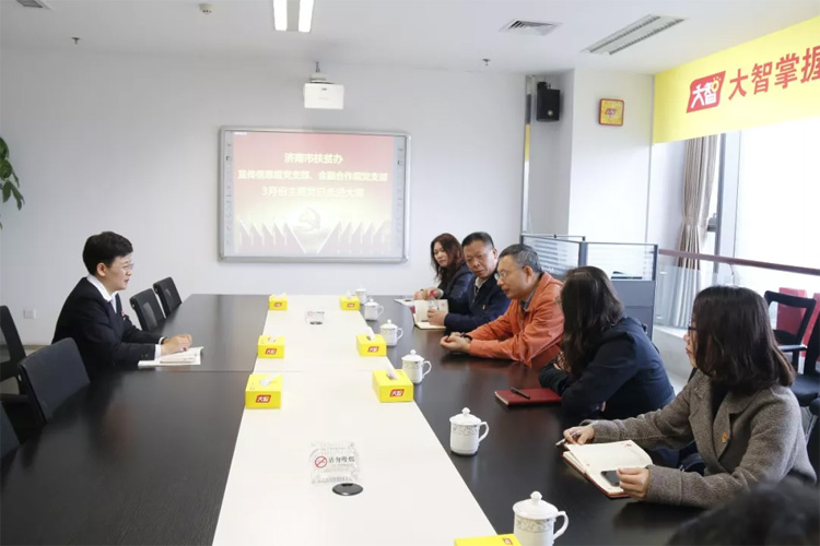 03月28日,市扶貧辦宣傳信息組黨支部書記張婉,市扶貧辦金融合作組黨支部書記徐磊一行7人蒞臨大智開展03月主題黨日活動,大智控股集團(tuán)黨委書記王現(xiàn)芹熱情接待。