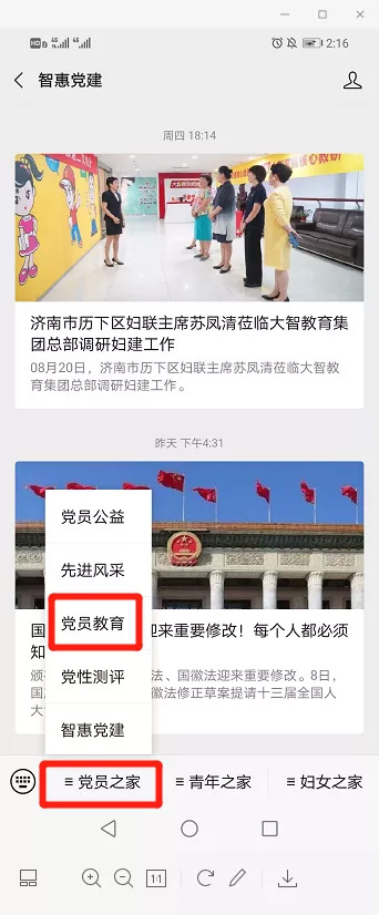 第二步:找到底部菜單“黨員之家”,點(diǎn)擊二級(jí)菜單“黨員教育”。